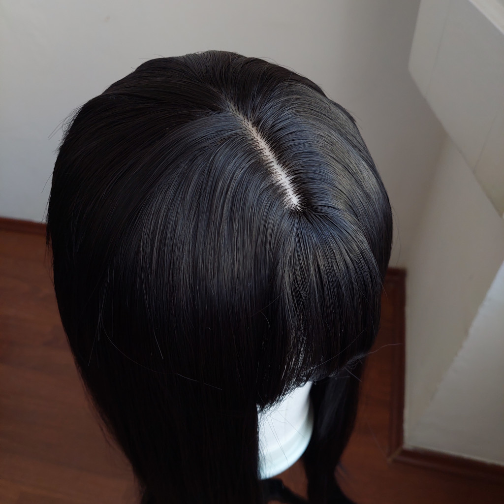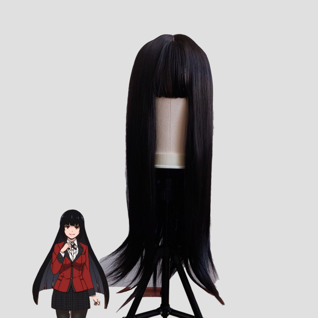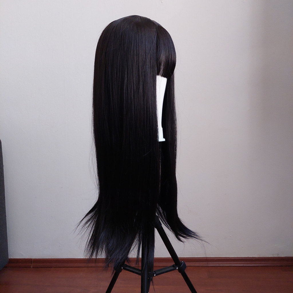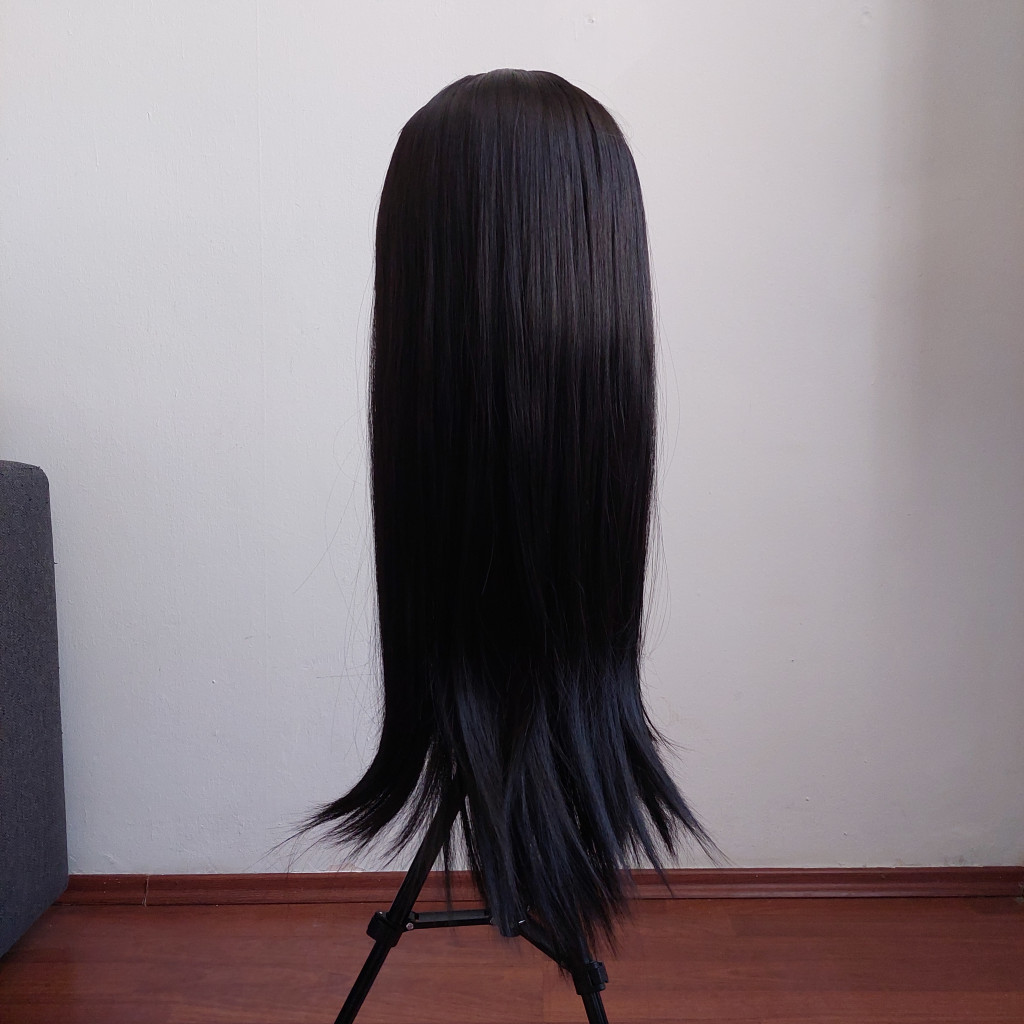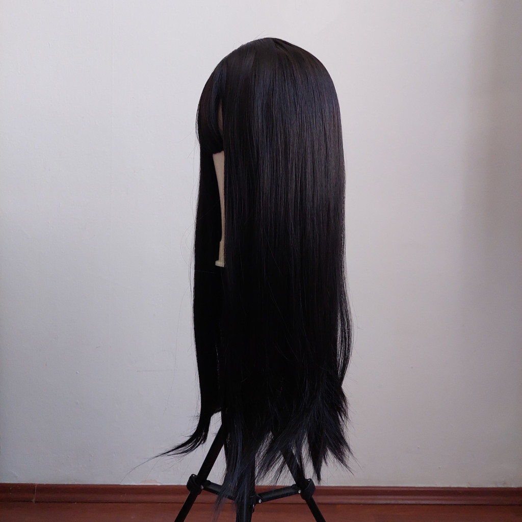 Hátul V alakra vágott, 86cm-es fekete hosszú frufrus paróka. Dús, a szálai vékonyabb, puha, fényes fajtájúak.