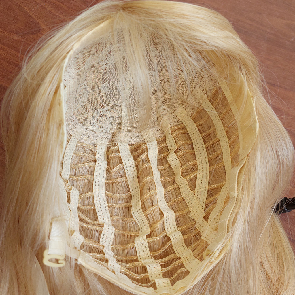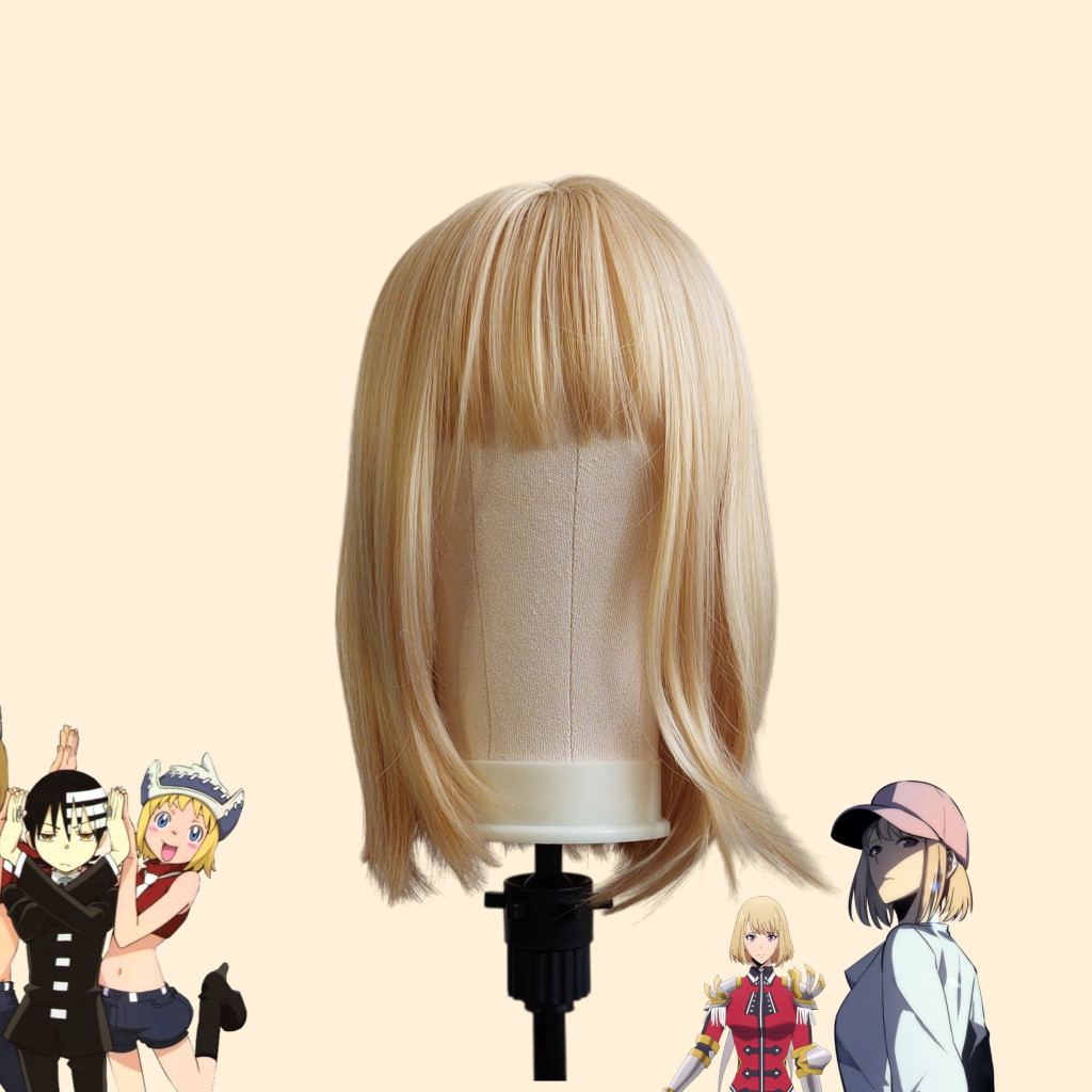 Nem túl fényes így természetes hatású szőke paróka, ~35cm hosszú, kevert színű szálai vannak. Megfelelő lehet Patty Thompson (Soul Eater), vagy Cha Hae-in (Solo Leveling) karakterekhez.