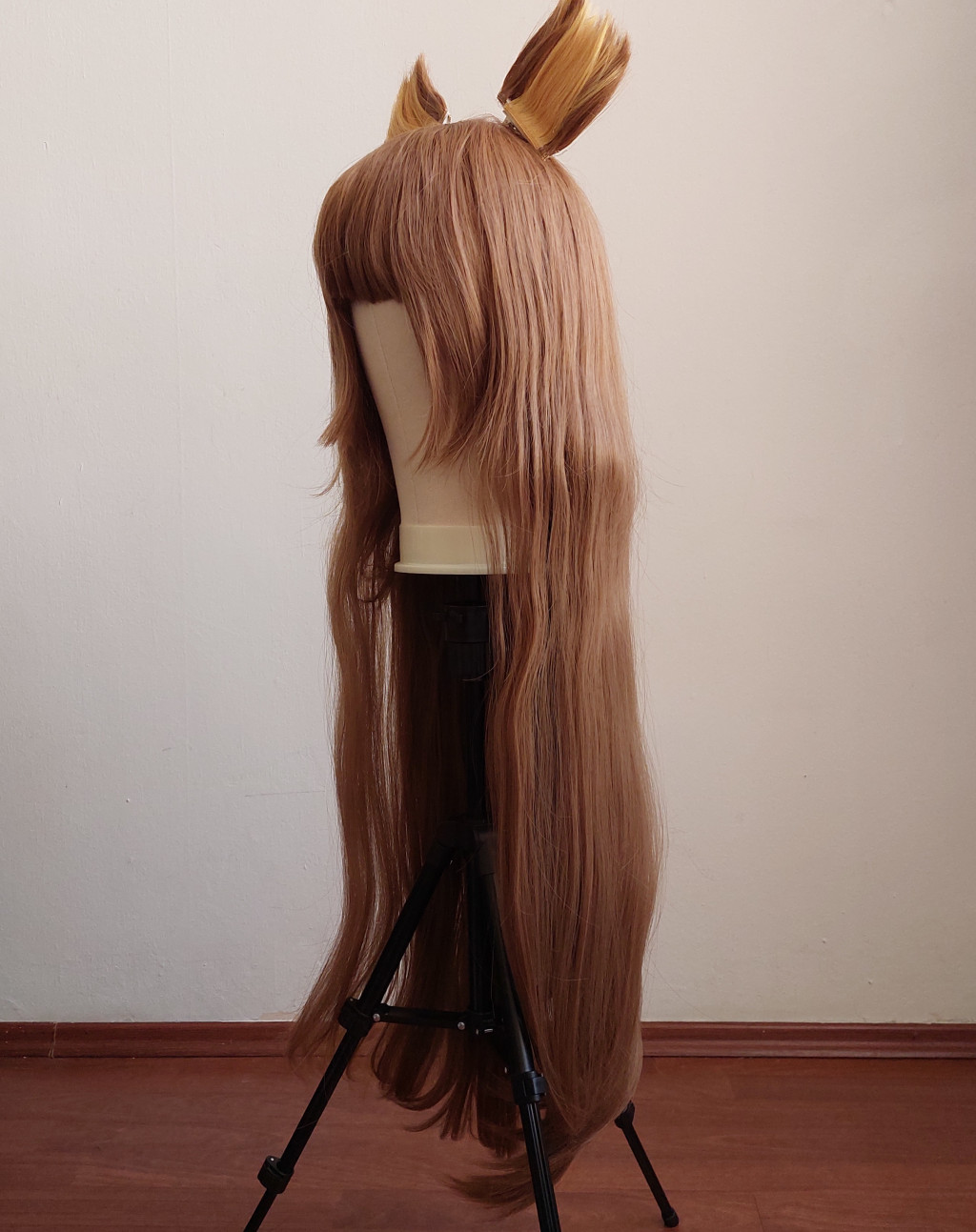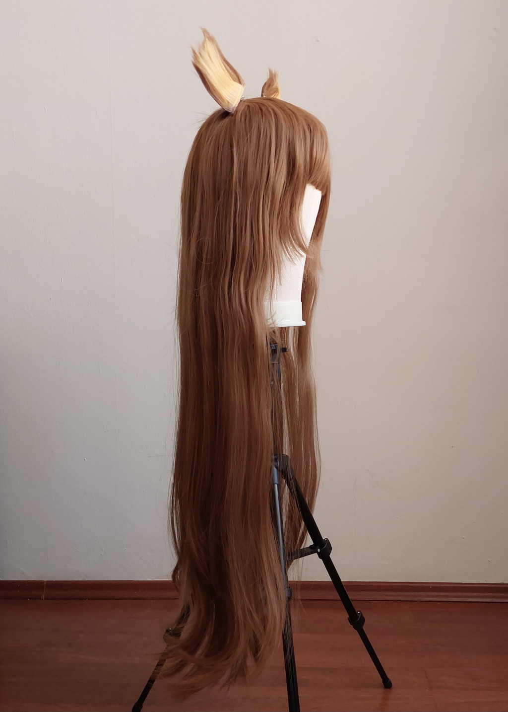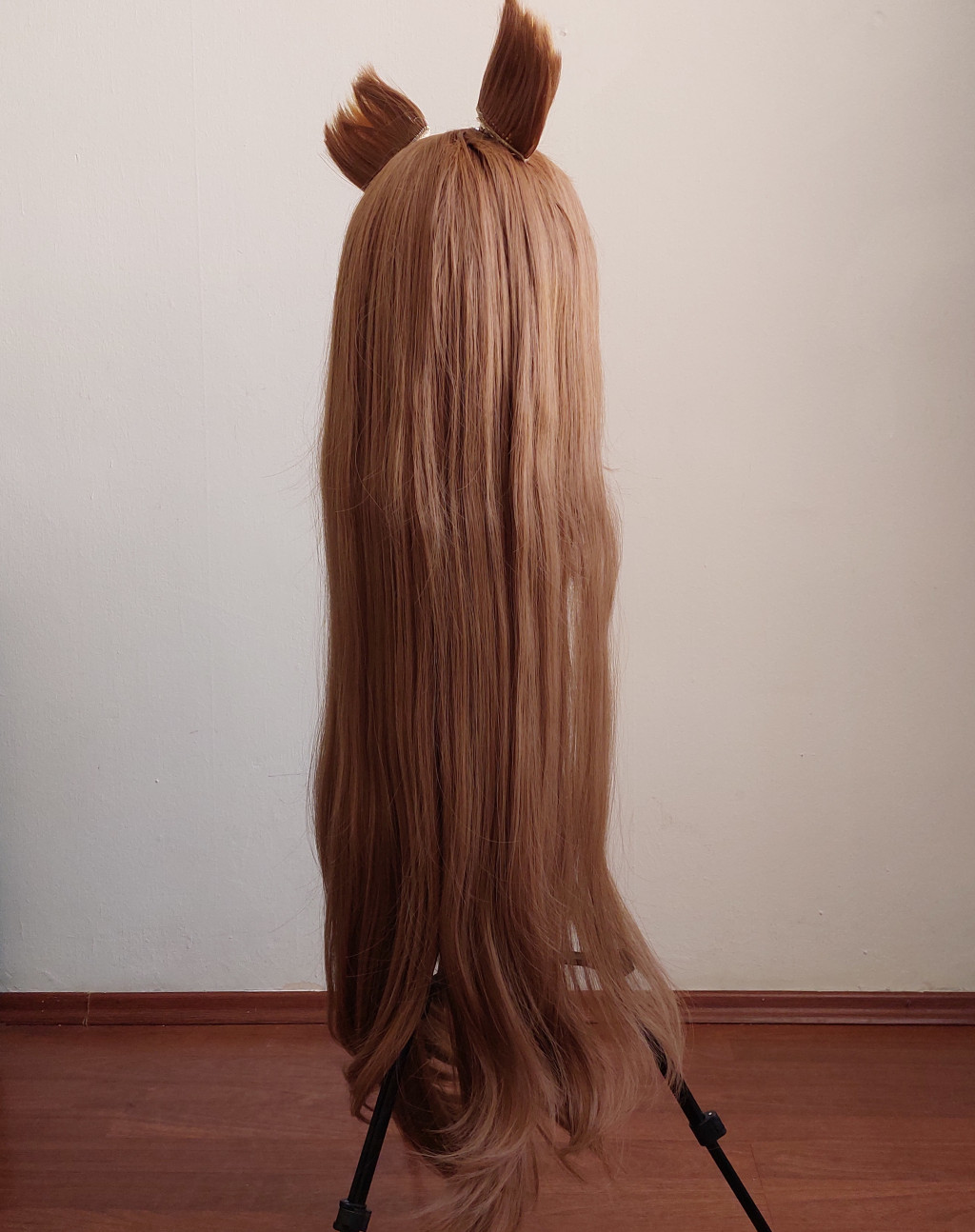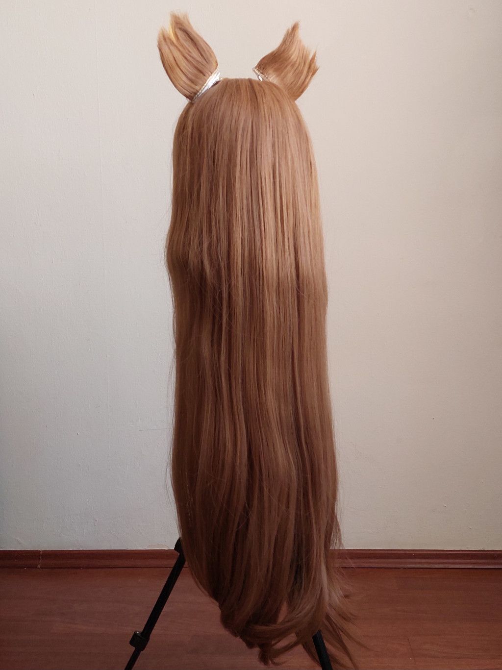 A paróka alapja egy 92cm-s barna egyenes paróka - ez önmagában használható más karakterekhez is. Mellé jár 2db "fül", amelyek jelenlegi állapotukban nem annyira karakterhűek, de ha kerekre vágod őket szuper darabok lehetnek, illetve 2 plusz tincs. Mivel amúgy extrém hosszú, szerintem jó pont neki, hogy nem túl dús így kevésbé lesz megterhelő a súlya viseléskor.