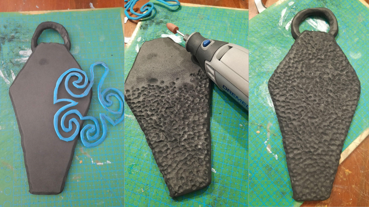 Amikor megvan az alapunk, fogjuk a Dremmel-t és kicseréljük a fejét egy kicsit domborúbb kőre. Használhatod az alap henger fejet is, csak azzal tapasztalataim alapján nehezebb elérni a kívánt textúrát. Mielőtt élesben nekiugrasz, kicsit gyakorolj egy darab EVÁ-n: próbálj különböző méretű, mélységű pontokat készíteni és nézd meg, hogy számodra melyik lesz a megfelelő. Miután már jól belejöttél, átugorhatsz a végleges darabra, nekem ez most a vállpáncél volt.